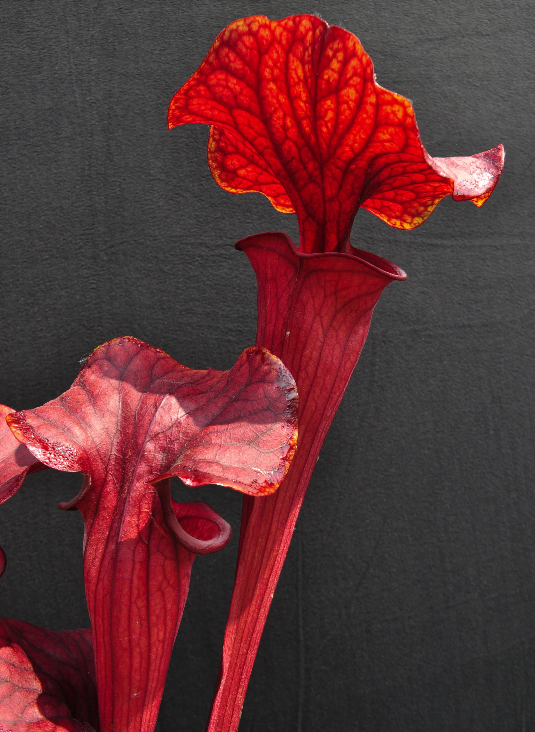 Ares is a vigorous and bold red hued cultivar from the early days of my breeding efforts. It grows to medium height with large pitchers that erupt in profusion early in the season, making a stunning show that holds up very well through the summer. This cross is almost certainly S. x redman on one side but the other half is uncertain. S. flava or S. x Doreen’s Colossus could be likely culprits.